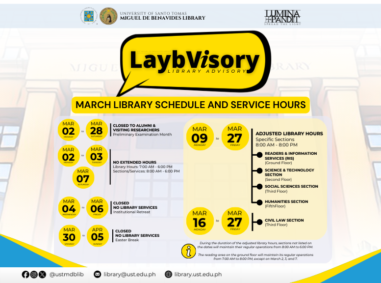 Please be advised that you are encouraged to update your personal information in your library account by accomplishing the “Library Account Form” via online or you may personally visit the General Circulation Section of the UST Library.
