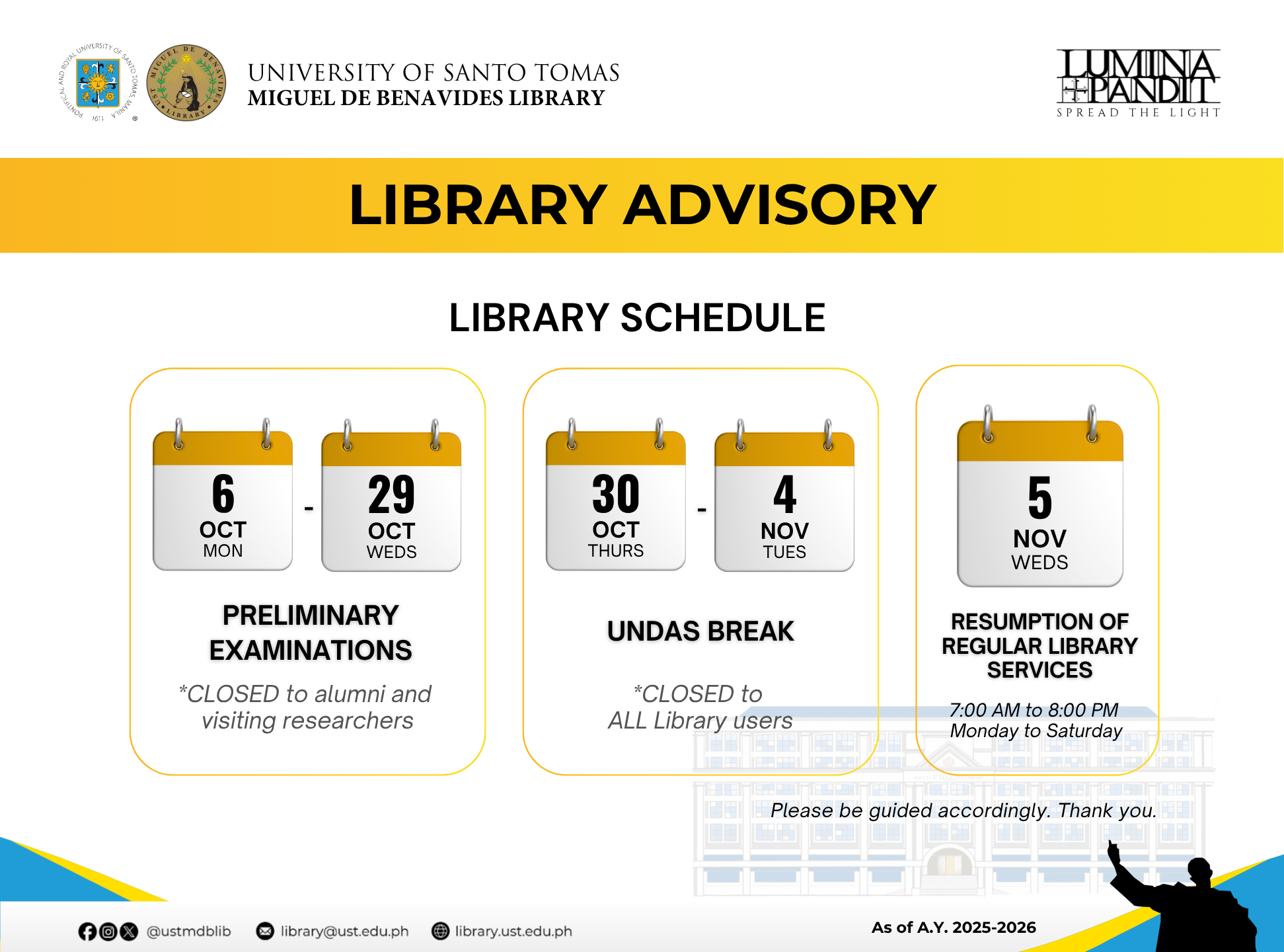 Please be advised that you are encouraged to update your personal information in your library account by accomplishing the “Library Account Form” via online or you may personally visit the General Circulation Section of the UST Library.